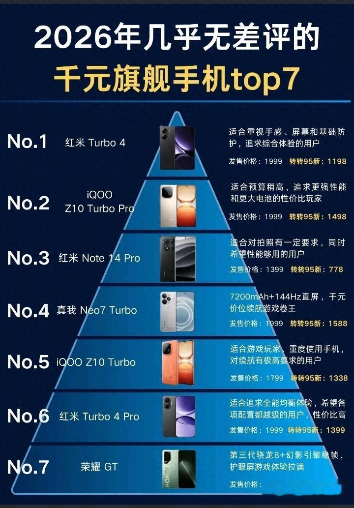 2026年3月中国智高手机阛阓迎来了一场浓烈的千元旗舰之争,各大品牌纷纷推出极具竞争力的新品以满足年青用户和学生群体对高性能与长续航的双重需求,在这个春深似海的季节里一份备受存眷的千元旗舰手机名次榜厚爱公布,这份榜单详确列出了七款在性能、续航、屏幕以及概括体验方面阐述超卓的机型,其中红米Turbo4凭借极高的性价比和平衡的概括实力荣登榜首,成为了当月最受蹂躏者接待的热点机型,这一法例不仅反馈了阛阓对高性价比产物的强烈需求,也展示了国产手机品牌在千元价位段重大的产物界说智商。