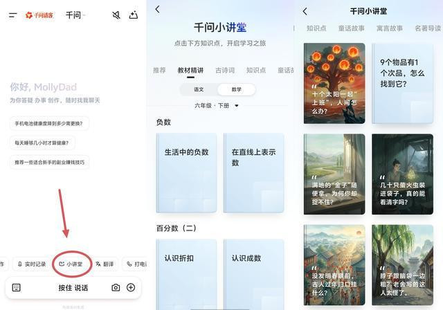 据先容,这次升级主要围绕三大学习场景张开。针对“新课初学难”,千问APP上线“小讲堂”AI讲教材功能,首批遮蔽小学一至六年齿语文、数学教材,并搭救童话、寓言等读物的互动考验。该功能通过语音、动态图示和领导式问答,将学问点转机为灵活易懂的本色。
