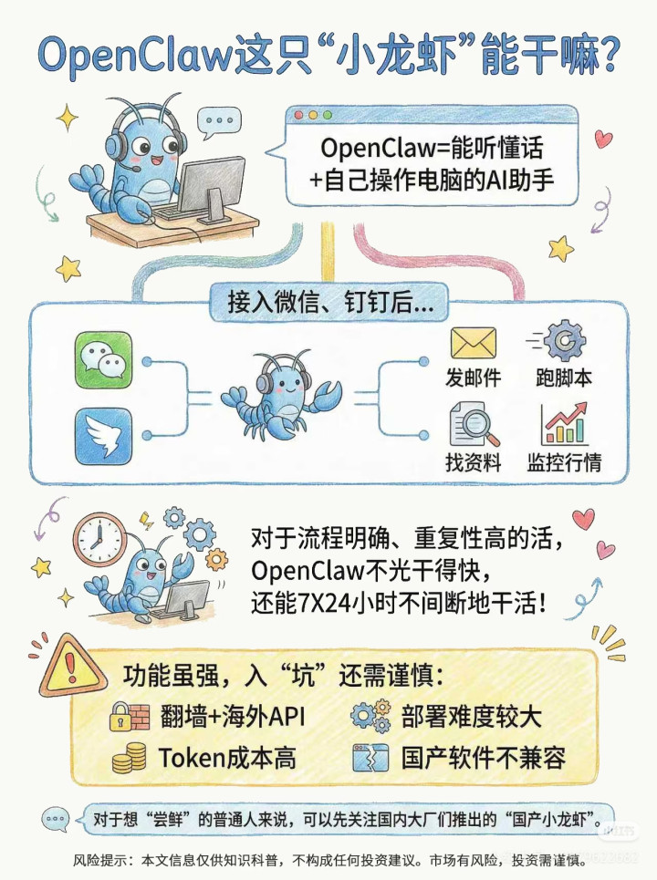 家东谈主们!最近AI圈澈底被一只“小龙虾”刷屏了!OpenClaw横空出世,胜仗把AI助手的天花板拉满——能听懂东谈主话、自动操作电脑,发邮件、跑剧本、找贵府、监控行情全给你干了,7×24小时不摸鱼!