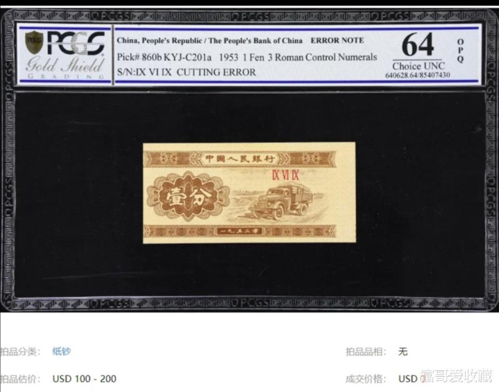 上面这张1953年(移印)的1分纸币,它的估价达到了200好意思元。亦然相比罕有的纸币系列。