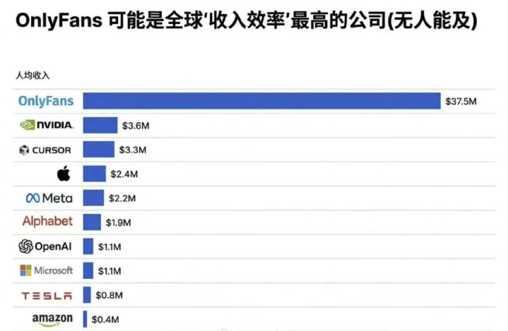 把柄金融数据公司Barchart的名次,OnlyFans已成为内行收入后果最高的公司,每位职工平均创造3760万好意思元营收。比拟之下,英伟达为360万好意思元,苹果为240万好意思元,Meta为220万好意思元,谷歌为190万好意思元。