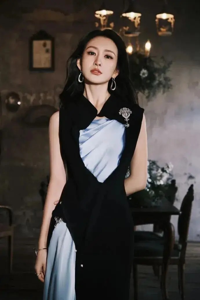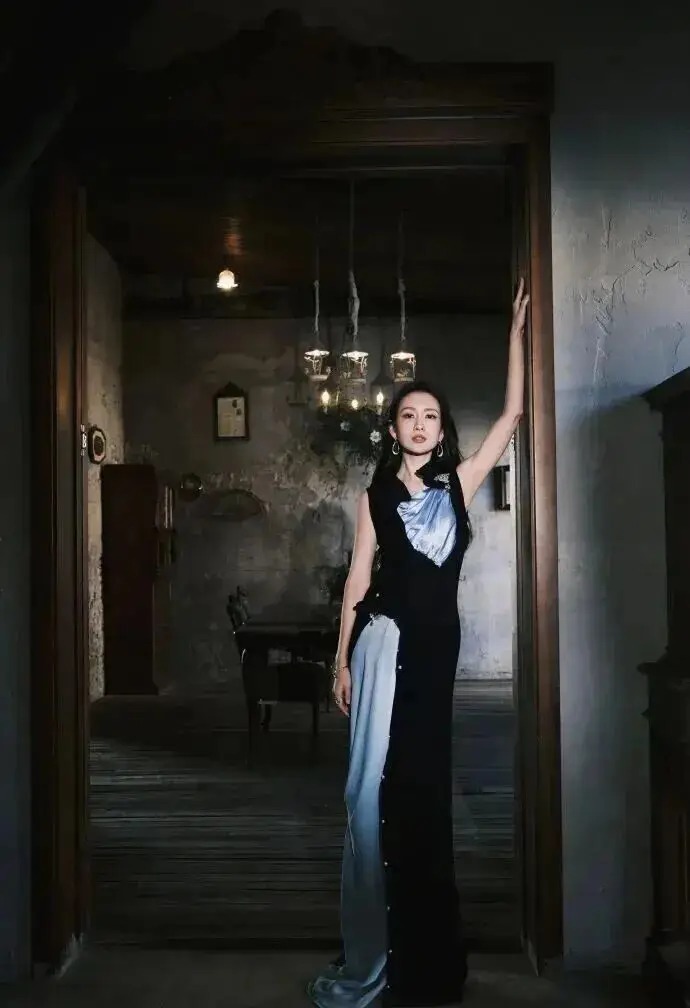 这套战袍的妙处在于色调的碰撞与剪裁的精确。玄色部分可能以挺括的西装或皮革材质呈现力量感,而宝蓝色块则以丝绒或缎面带来浪费质感。拼接线条干净利落,完好分割体格比例。她粗略内搭从简,或将长发利落梳起,妆容要点隆起眉眼与红唇。只需静静耸峙,那份冷静自信、傲视全场的气场便已满格。