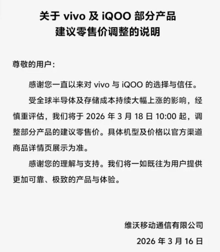 vivo 在官方公告中明确,受大家半导体及存储资本抓续大幅高涨影响,经安靖评估,将于 3 月 18 日 10:00 起退换部分居品提出零卖价,具体机型及价钱以官方渠谈公示为准,并有利为死亡者预留两天缓冲期,可按原价完成购买。vivo 方面对此恢复称,近期上游存储等中枢器件供货与资本波动较大,行业大宗面对阶段性压力,调价是基于市集近况的阶段性策略退换。