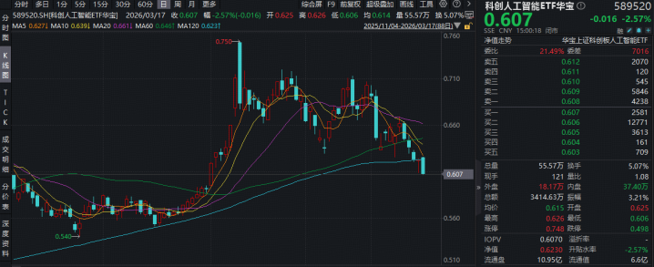 当天(3月17日)A股三大指数集体收绿,重心布局国产AI产业链的科创东说念主工智能ETF(589520)随市回调,场内价钱收跌2.57%,资金却呈现“越跌越买”的态势,上交所数据表露,该ETF近5个来回日累计吸金3660万元,反馈资金看好国产AI赛说念后市阐发,提前进场埋伏!