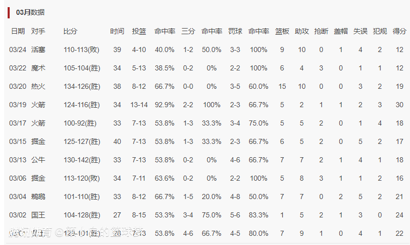 勒布朗-詹姆斯仍是流畅11场比赛脱手不杰出15次,惟有在3月2日对阵国王的比赛中脱手了15次 ,3月19日对阵火箭的比赛中脱手14次,其余的比赛詹姆斯的脱手皆在13次及以下。