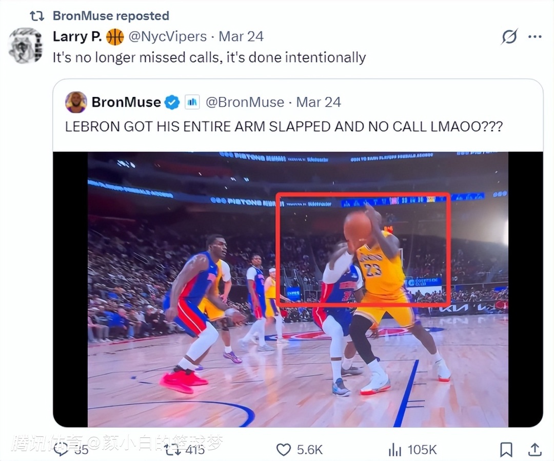 在对阵活塞的比赛中,詹姆斯只脱手10次,外线投篮2次,其余八次皆在三秒区内可他只取得3次罚球,何况这场比赛有两个争议判罚,第一节詹姆斯明显被打手但活塞挑战凯旋,第四节詹姆斯封盖后活塞则挑战凯旋是一个侵犯球。41岁的勒布朗屡次被裁判针对。