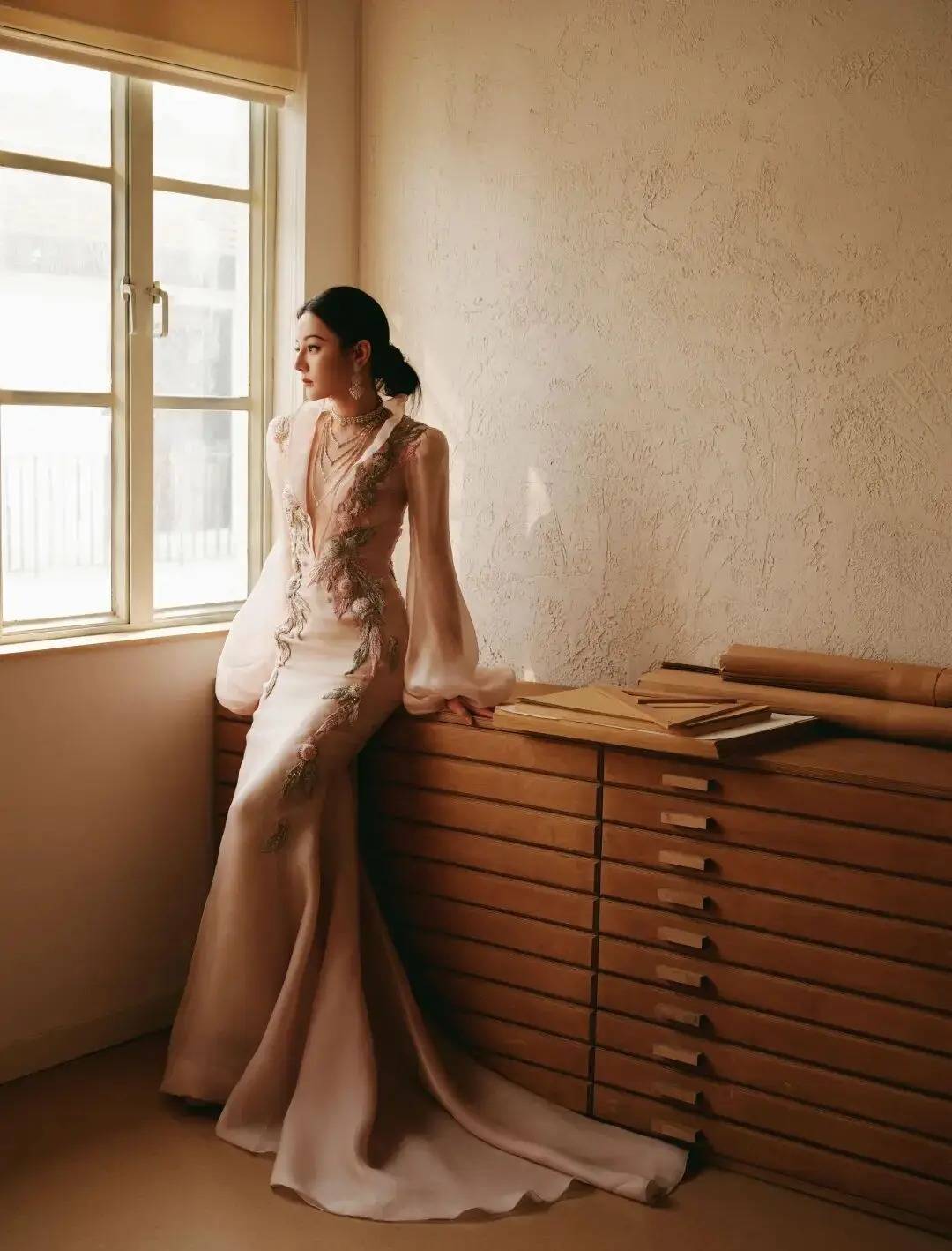 迪丽热巴身着一袭浅粉深V刺绣礼裙现身,将“东谈主间绝好意思”四字化为可触碰的视觉推行。清浅轻柔的粉色宛如被早霞浸染的云朵,齐备中庸了她浓颜的冲击力,注入仙气;而神勇的深V剪裁与裙身精雅繁复的立体刺绣,则在柔好意思中交汇出丽都与性感的张力,让她宛如一件行走的、无价之宝的艺术品,好意思得令东谈主失语。
