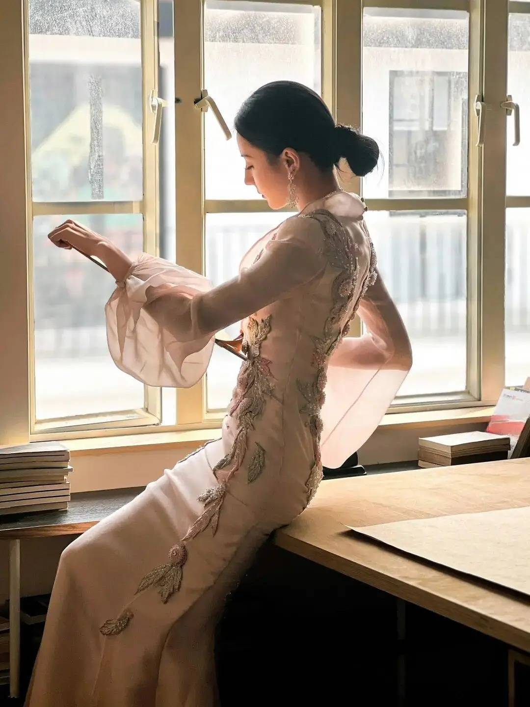 这条礼裙的工艺号称匠心独运。浅粉的薄纱底上,huangguan体育app以银线或同色丝线绣满了精雅的花朵藤蔓,立体而活泼,在灯光下泛着邃密直快。深V领口极致延长,展现优胜的颈部线条与锁骨。裙摆能够如花瓣般层层铺开,跟着她的设施,刺拈斑纹仿佛也随之摇曳生姿。她微卷长发披肩,回眸间眼波流转,仙气与荣华并存。