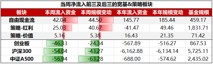 具体到细分板块,宽基&策略板块ETF中,净流入前三大板块挨次为:目田现款流、策略-红利、策略-价值;净流出前三大板块挨次为:中证A500、沪深300、创业板。