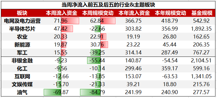 行业&主题板块ETF中,净流入前五大板块挨次为:电网及电力运营、半导体芯片、农业、新动力、军工;净流出前五大板块挨次为:油气、娱乐传媒、互联网、化工、非银金融。